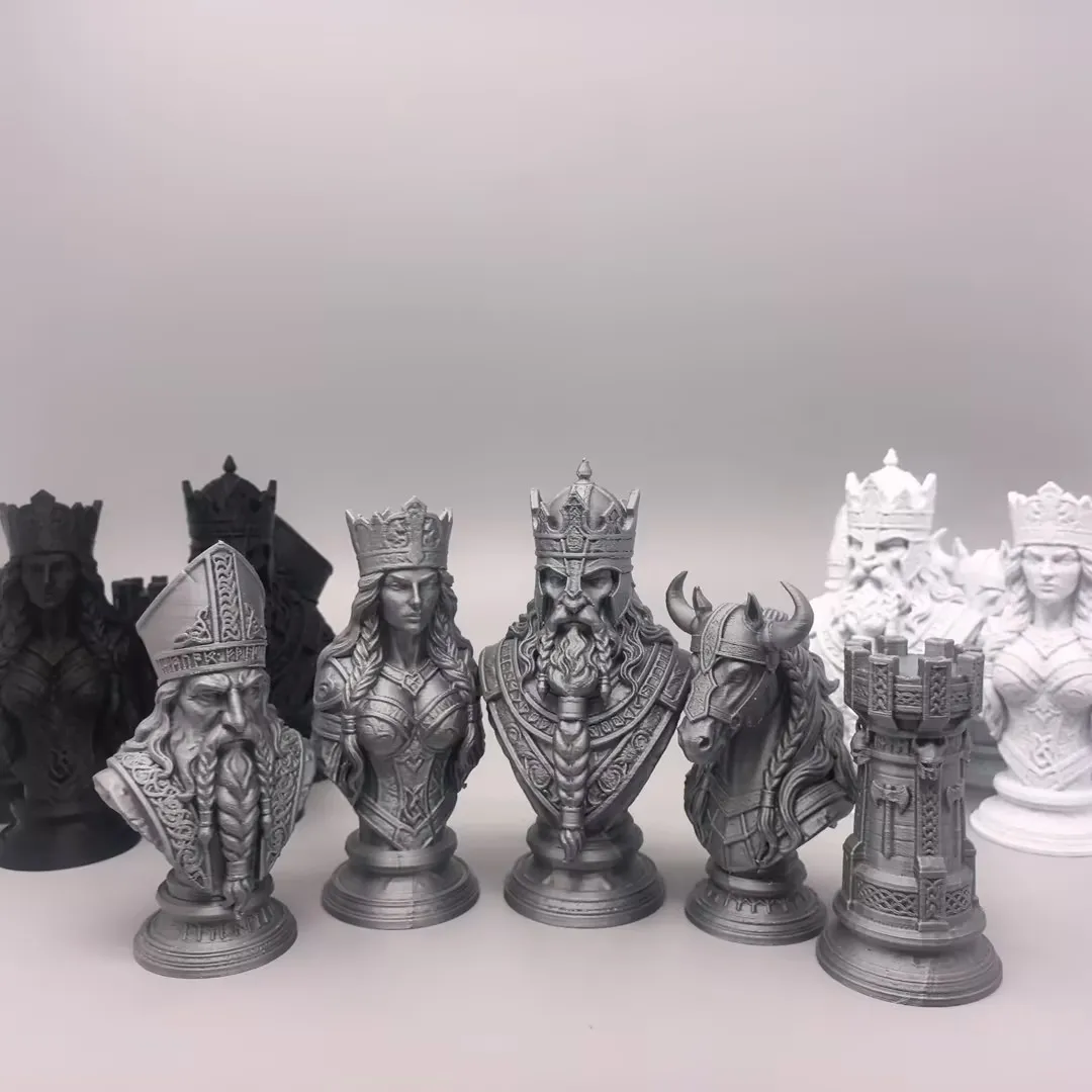 Inspired by Norse mythology and Viking legends, this chess set embodies the ancient warrior spirit in finely crafted metal busts. Each piece is intricately carved with iconic symbols of the Viking Age: the King, bearded and majestic like a snow-capped lord; the Queen, crowned with layered regalia, her flowing hair like a battle banner; the Bishop, robed with a high crown and wise gaze as if deciphering runes; the Knight, transformed into a horned-helmeted warrior, brimming with battle fervor; and the Rook, standing tall as an indomitable Nordic stone tower. The cold metallic sheen and handcrafted texture lend weight to every move, as if holding a tangible piece of epic history.